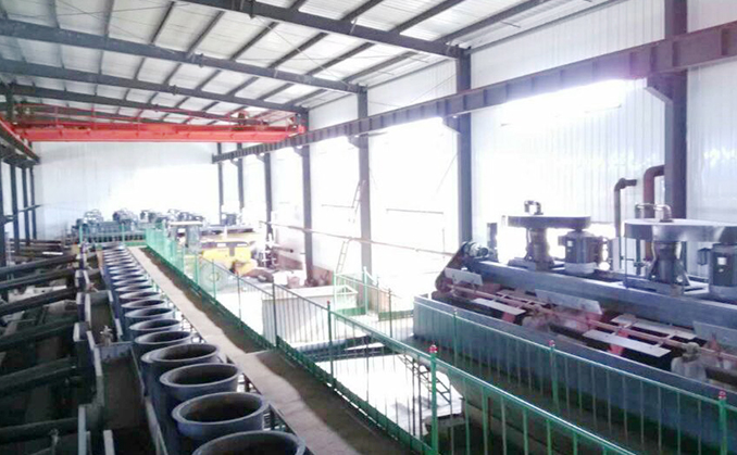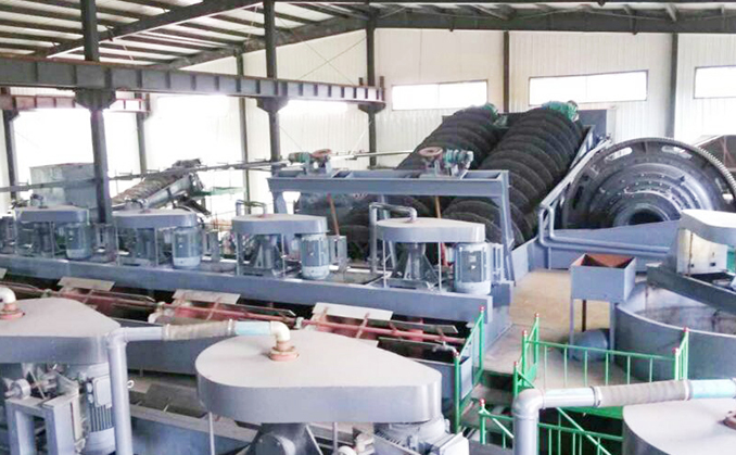 該項(xiàng)目分兩條生產(chǎn)線,第一條為2000t/d,第二條為1000t/d。破碎采用三段一閉路流程,浮選采用9磨11選,浮選精礦品位達(dá)到95%以上,浮選精礦經(jīng)刨刀卸料離心機(jī)脫水后經(jīng)過烘干機(jī)烘干,然后經(jīng)過分目篩分成不同尺寸,然后進(jìn)行銷售。
